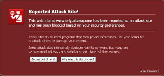 The FireFox browser has a built-in check against Google’s database of web sites containing malicious scripts, exploits and malware. Looks like Orly made the list. I used to volunteer for an organization that validated reports for Google, and I’ve seen Google warnings many times, albeit on phishing sites mostly.