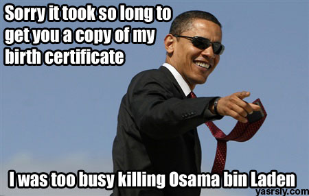 One of my friends (who, like me, uses a C-PAP) noticed that bin Laden had a C-PAP by his bed (don’t worry about the fishes he now sleeps with being disturbed by his snoring, though, Seal Team 6 cured his sleep apnea – with extreme prejudice!). How strange that they’ve covered up the dialysis equipment but let in the C-PAP – it’s only a matter of time that some birther notices this and constructs an elaborate conspiracy…