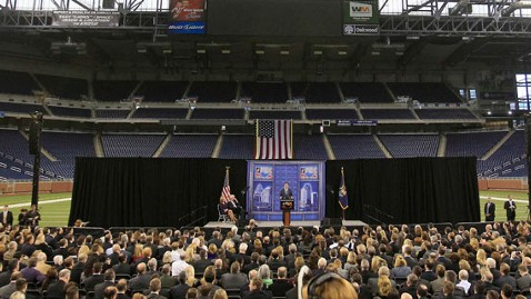 No big deal, but I was struck by this February 24 photo of Mitt Romney addressing a gathering of his supporters at Detroit’s Ford Field in his home state of Michigan for what was billed as a major economic address and the announcement of new economic initiatives. (Photo by Carlos Ororio/AP Photo)