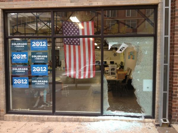 The Denver Post reports that a shot was fired at the Denver headquarters of Obama for America, destroying a plate glass storefront window. Workers were in the office when the shooting occurred, but no one was injured. Police have a description of a "possible vehicle of interest."